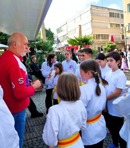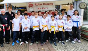 Es war ein beeindruckender und sonniger Sonntag Ende September, der genauso wie vor zwei Jahren, die Kempo-Abteilung des BSV „Roter Drache“ Kleve e.V. dazu veranlasste, erneut der Einladung der Stadt Kleve zum Tag der Vereine zu folgen und sich mit zahlreichen Darbietungen der Öffentlichkeit mitten im Herzen von Kleve am Elsabrunnen vorzustellen. Die Kids und einige Kempoka aus der Erwachsenengruppe hatten sich im Vorfeld an den Trainingstagen intensiv darauf vorbereitet…. sei es durch das Zeigen von Kumite, verschiedenen Schrittdiagrammen sowie von unterschiedlichen Kata, aber auch dem Kontern gegen Kontaktangriffe in der Selbstverteidigung. Eine kurze Vorführung von Langstock-Formen (Kata) als auch die Abwehren gegen diverse Kurzstockangriffe fehlten am Ende dann auch nicht. Das durchaus abwechslungsreiche Programm ließ einige Zuschauer innehalten. Sie zeigten dabei reges Interesse an der Performance. Ergänzt wurde das Auftreten des Roten Drachen erfreulicherweise dieses Mal durch weitere Mitglieder einer anderen Abteilung. Zwei Dju-Ssuka zeigten unterschiedliche Selbstverteidigungstechniken im Stand sowie Boden. Neben der Fallschule wurden zudem Abwehrtechniken aus dem Jiu Jitsu Prüfungsprogramm dargeboten, wobei auch Waffen zum Einsatz kamen. Es war insgesamt eine sehr erfreuliche und runde Sache. Nach dem Abgrüßen gab es dann noch ein Eis aus der nahegelegenen Eisdiele als Überraschung. Das Abbauen erfolgte dann mit vielen flinken Händen.
