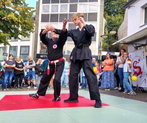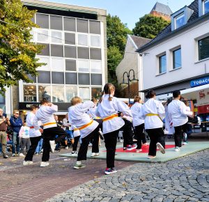 Insbesondere die Darbietungen der Kempo Abteilung, unter Anleitung von Heinz-Jürgen Naß, führten bei den Anwesenden Menschen in der Fußgängerzone zu beeindruckten Gesichtern.
