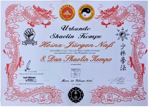 Mit der Überreichung der Verleihungsurkunde zum 8. DAN Shaolin Kempo wurde ihm erneut Wertschätzung und Anerkennung für die vielen Jahre der Verbundenheit zum Shaolin Kempo zuteil, einem Weg (dō 道), der hoffentlich noch viele weitere Jahre begehbar sein wird, getragen von vielen anderen lieben Mitmenschen und dem Geist des Budo.